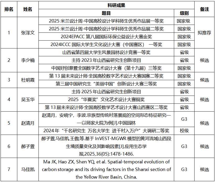 根据《关于开展我校2025年研究生国家奖学金评选工作的通知》文件精神和《山西农业大学研究生国家奖学金评审办法》和《山西农业大学城乡建设学院研究生国家奖学金评审细则》等文件精神,城乡建设学院2025年研究生国家奖学金指标1个。2025年10月10日,城乡建设学院研究生国家奖学金评定委员会对本年度申报国家奖学金的材料进行了评审,现对所有参评研究生的材料及拟推荐名单予以公示。