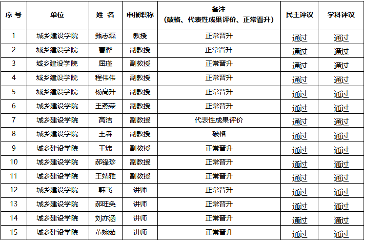 城乡建设学院中高级职称民主评议和学科评议结果公示
