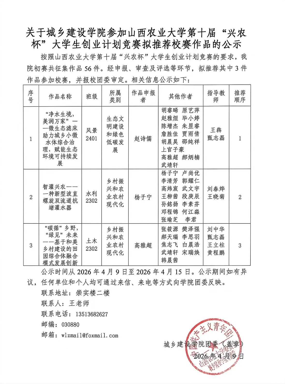 关于城乡建设学院参加山西农业大学第十届“兴农杯”大学生创业计划竞赛拟推荐校赛作品的公示