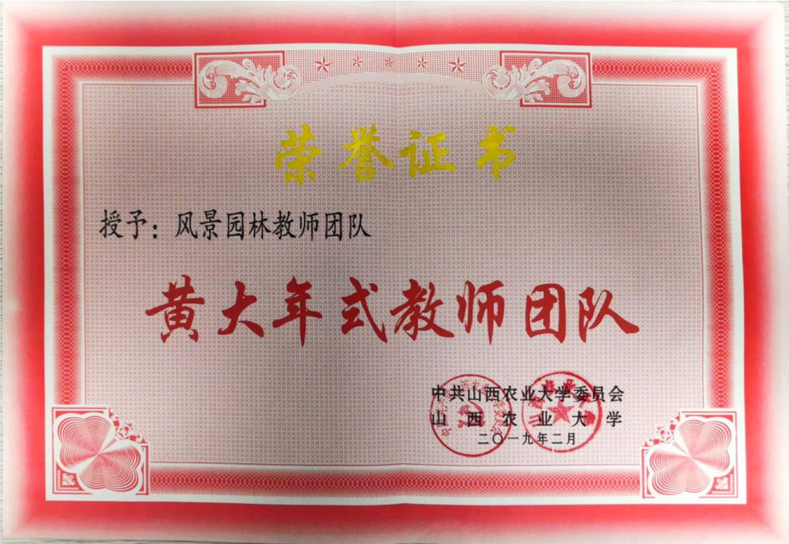 为深入贯彻落实习近平总书记对黄大年同志先进事迹的重要指示精神,号召广大教师持续向黄大年同志学习,城建院教师积极组建团队,认真挖掘和宣传教书育人模范,风景园林教师团队于2019年2月荣获黄大年式教师团队荣誉称号。