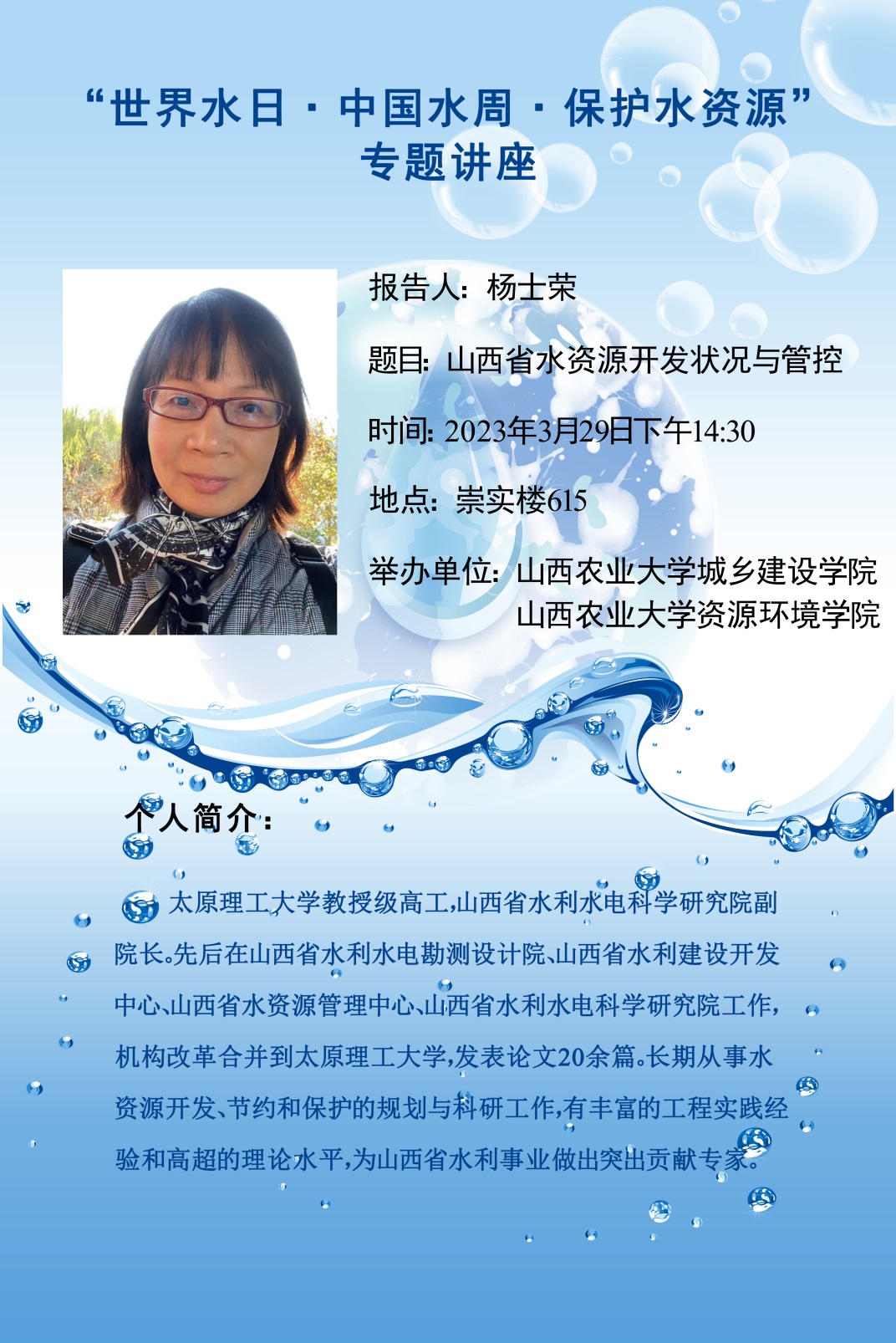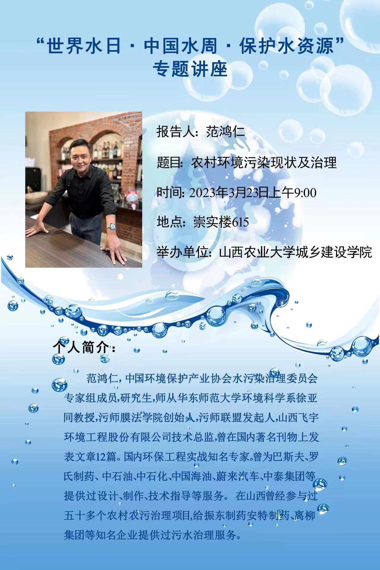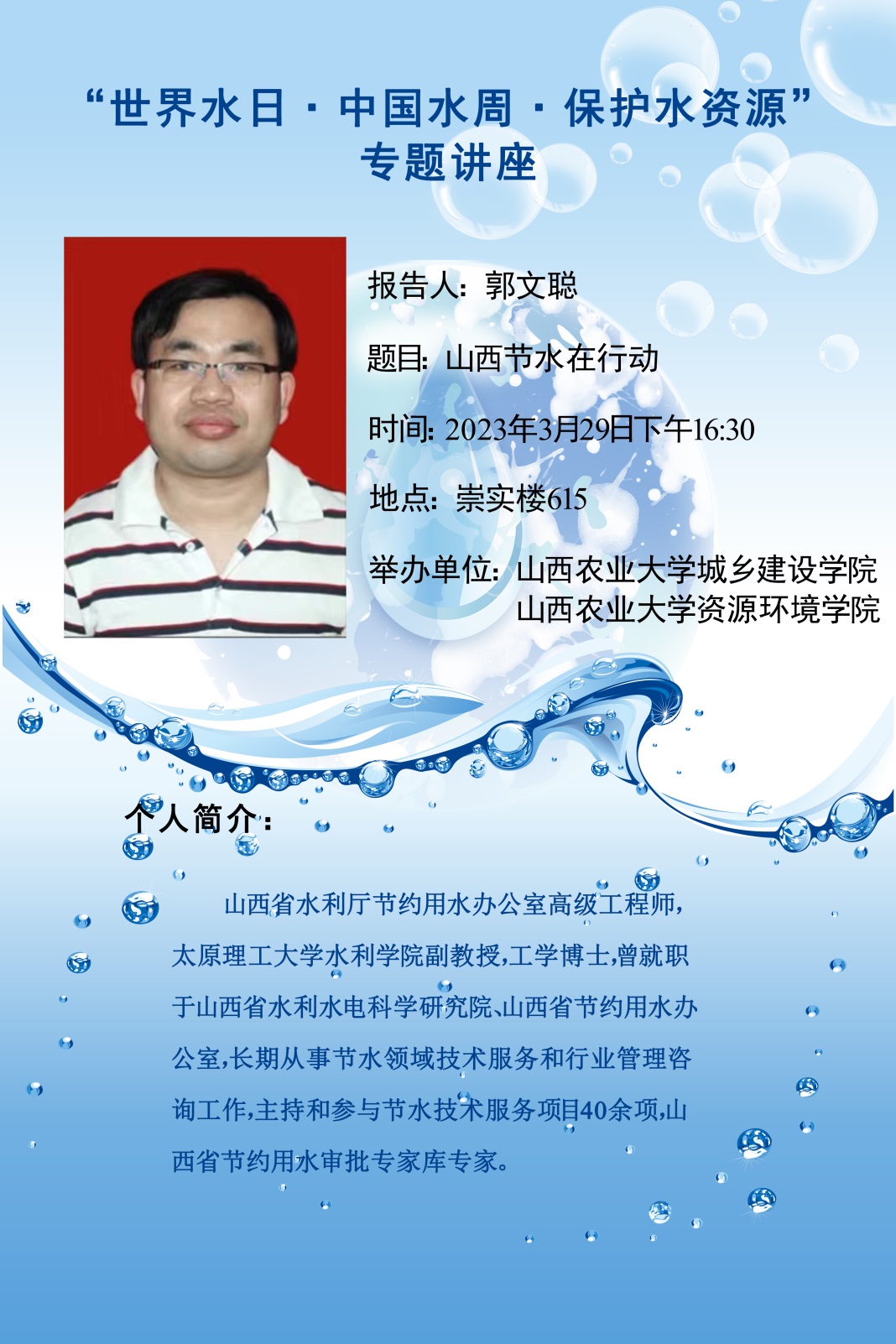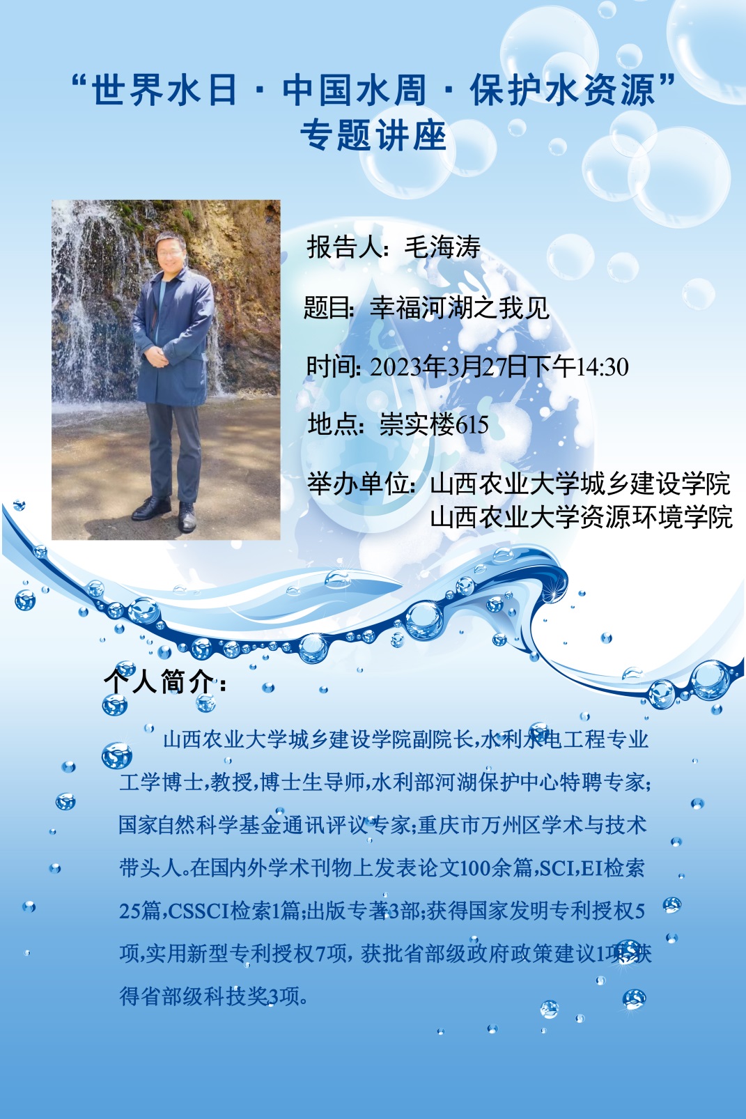2023年3月22日是第三十一届“世界水日”,3月22—28日是第三十六届“中国水周”。今年“世界水日”主题为“Accelerating Change(加速变革)”,“中国水周”活动主题为“强化依法治水携手共护母亲河”。为增强我院师生的节水意识和宣传爱护水资源的理念,我院邀请了太原理工大学杨士荣教授级高工(原山西省水利水电科学研究院副院长),中国环境保护产业协会水污染治理委员会专家组成员范鸿仁高级工程师,太原理工大学郭文聪副教授(原山西省水利厅节水办公室高级工程师)以及我院毛海涛教授为大家作报告,此外,还开展丰富多彩的科普活动。