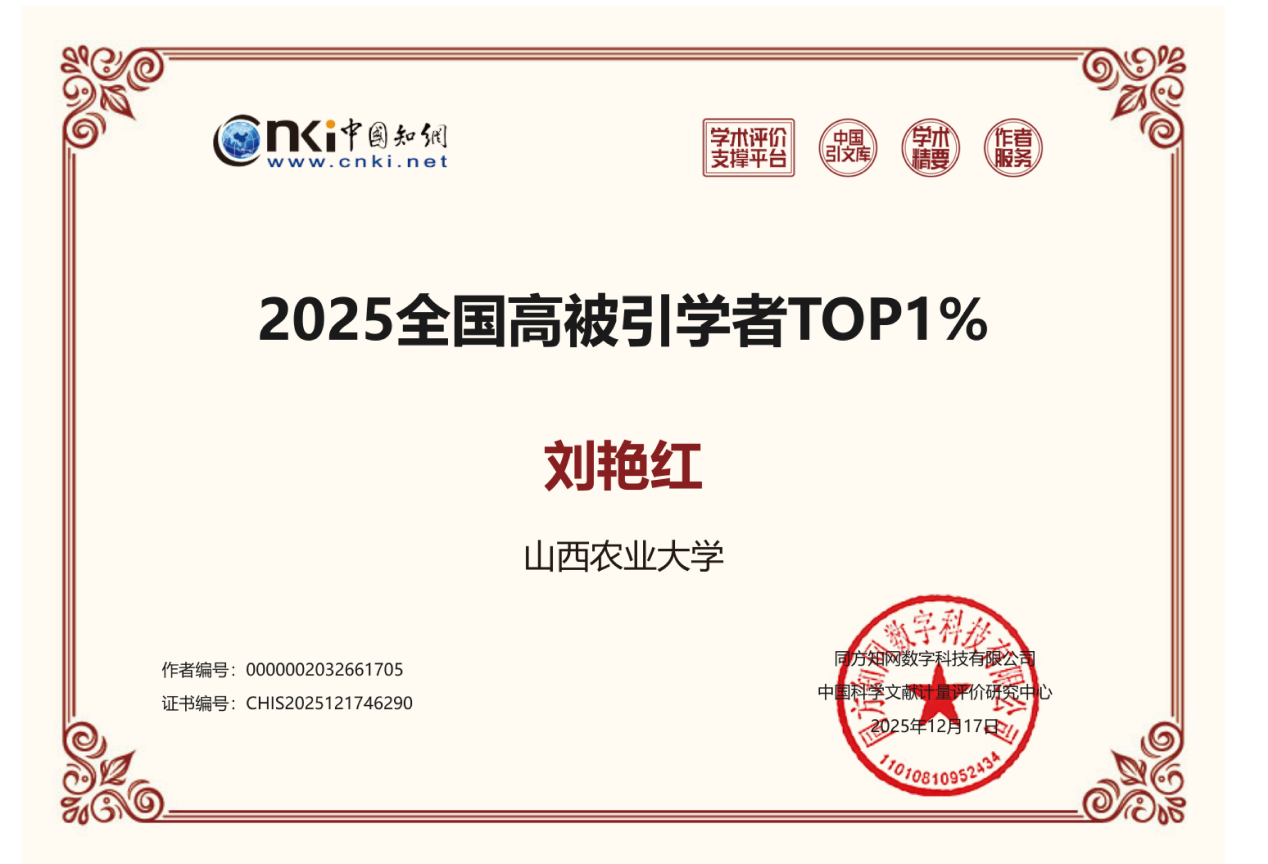 近日,中国知网下属的中国科学文献计量评价研究中心正式发布了“2025全国高被引学者”榜单。我院刘艳红副教授以其在风景园林学领域的卓越学术影响力,成功入选该榜单Top 1%行列。