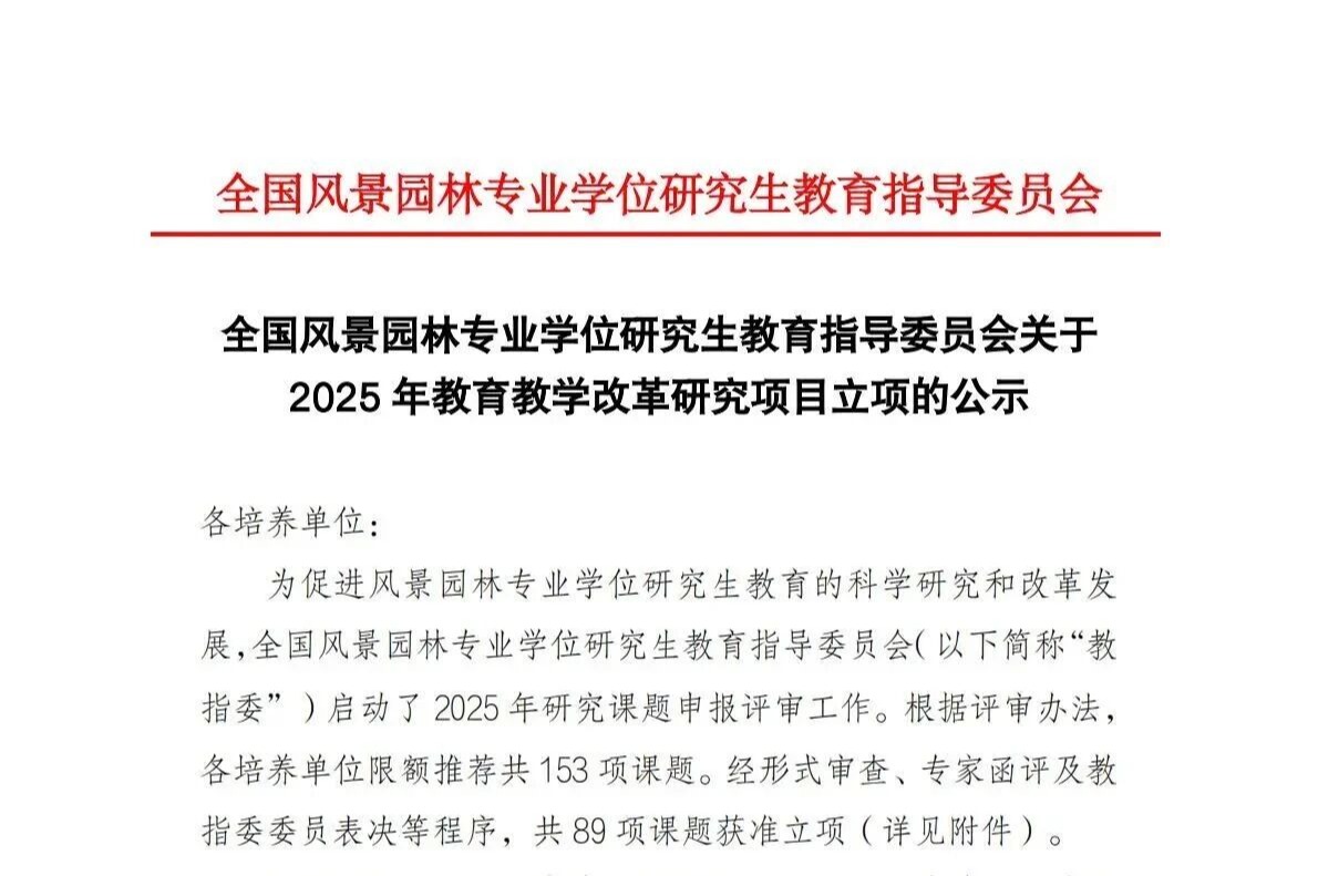 据悉,教指委2025年教育教学改革研究项目申报工作启动后,各培养单位限额推荐共153项课题。经形式审查、专家函评及教指委委员表决等严格程序,最终89项课题获准立项,杜方教授主持的项目位列其中。该项目以产学研一体化为核心,聚焦校企地三方协同育人机制的构建与实践,是对风景园林专业学位研究生实践育人模式的探索与创新。