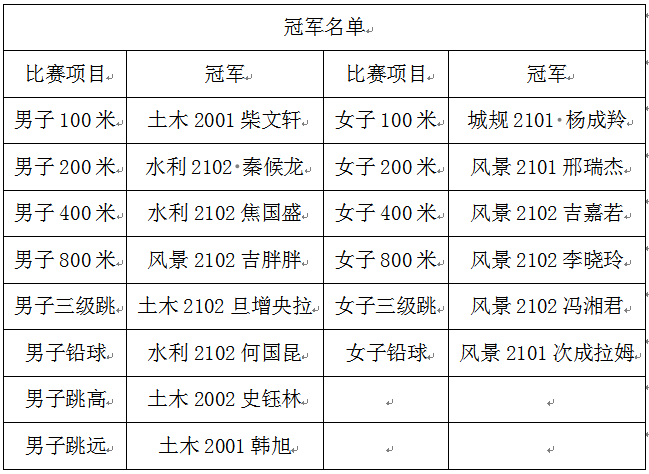 此次运动会共分为三个部分:径赛预选赛、田赛和决赛。径赛包括男女100米、200米和400米短跑,800米中长跑,接力赛等,田赛包括铅球、跳远、跳高等。比赛中,选手们热情饱满,奋勇拼搏,力争上游,同学们有的高喊加油,有的搀扶送水,分工明确,有条不紊,现场气氛随着起跑的枪响逐渐热烈,整个场面热闹非凡。运动员们均努力以最好的成绩为班级争光,用行动去追求着“更高、更快、更强”的体育精神,赛出了成绩、赛出了水平、赛出了风格。经过将近一天的比拼,最终风景2102班、水利2102班、风景2101班分别获得团体总分第一名、第二名、第三名。