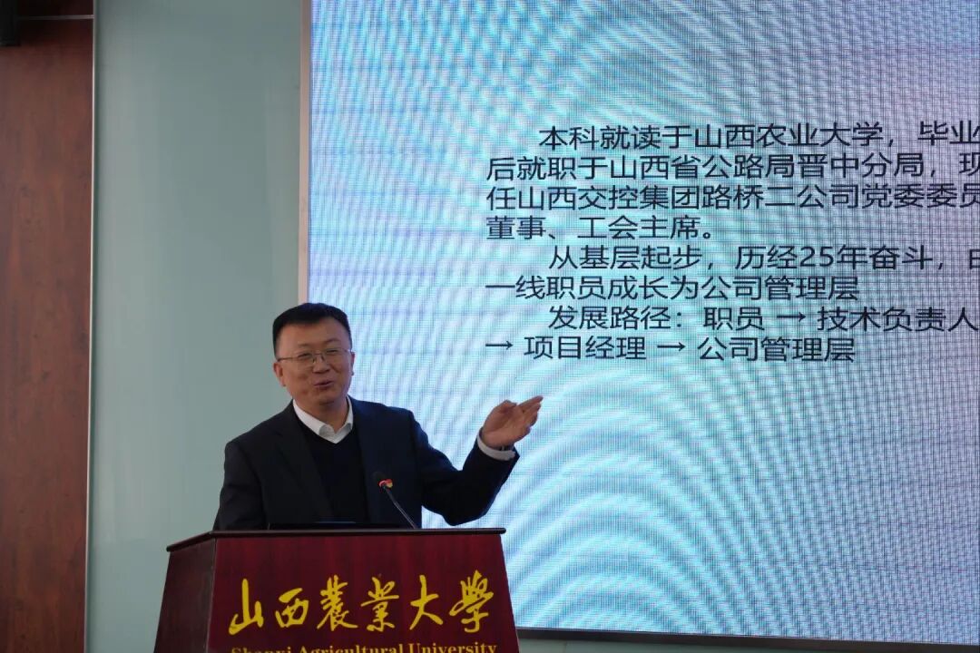 报告会上,郭虎校友分享了自己从山西农业大学毕业后,扎根基层、持续奋斗二十五年的职业历程。他从一名普通职员起步,先后担任技术负责人、项目副经理等多个职务,逐步晋升为山西交控集团路桥二公司党委委员、董事、工会主席。郭虎指出,公司秉持“不唯专业背景,唯看能力适配”的用人理念,为有准备、勇担当的年轻人提供了广阔的发展平台。他勉励学弟学妹不畏艰苦、不惧基层起步,珍惜每一个岗位的锻炼机会,在实践中不断积累经验、锤炼能力。