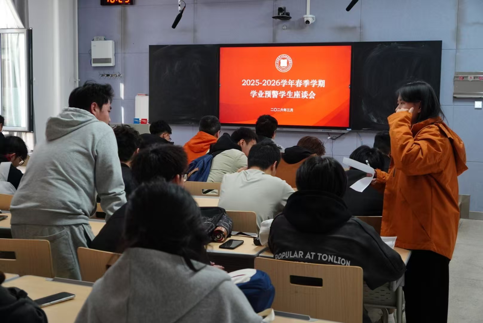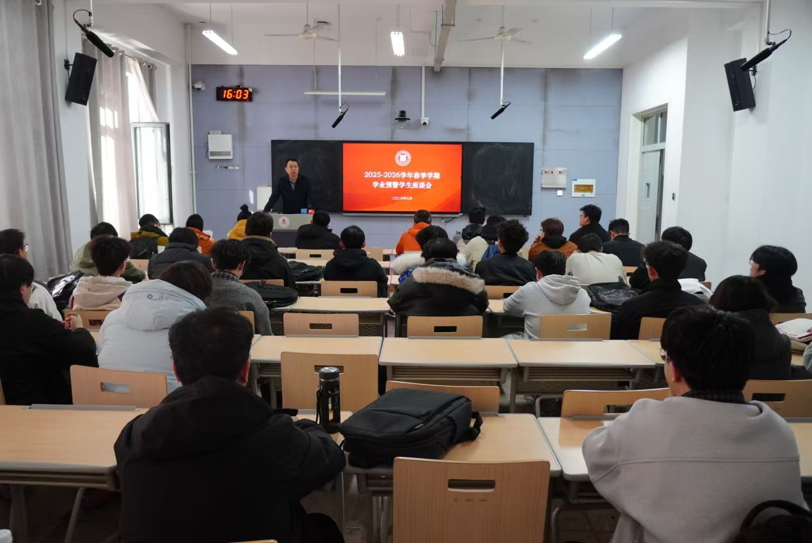 冯涛在动员讲话中从家国情怀的高度出发,勉励同学们端正学习态度,将个人成长融入国家发展大局。他强调,学院始终坚持“以生为本”的育人理念,绝不会放弃任何一位遇到困难的同学。他建议同学们在日常学习中主动与任课教师、班级学委建立良好沟通,形成互助共进的学习氛围。同时,要以此次学业预警为鞭策,着眼长远发展,脚踏实地、迎难而上,在后续学习中实现稳步提升。